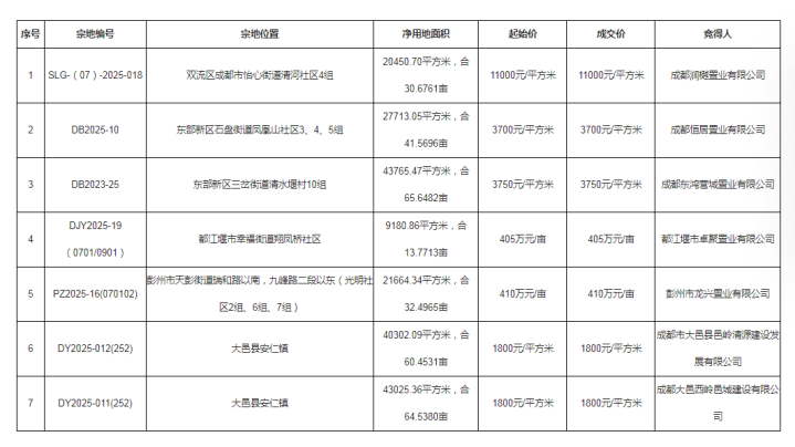 成都7宗土地, 全部底价拍出